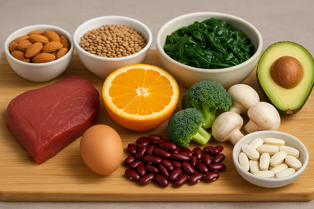 Assorted nutrient-dense foods including beef, avocado, broccoli, spinach, mushrooms, lentils, orange, kidney beans, almonds, and supplements on a wooden board