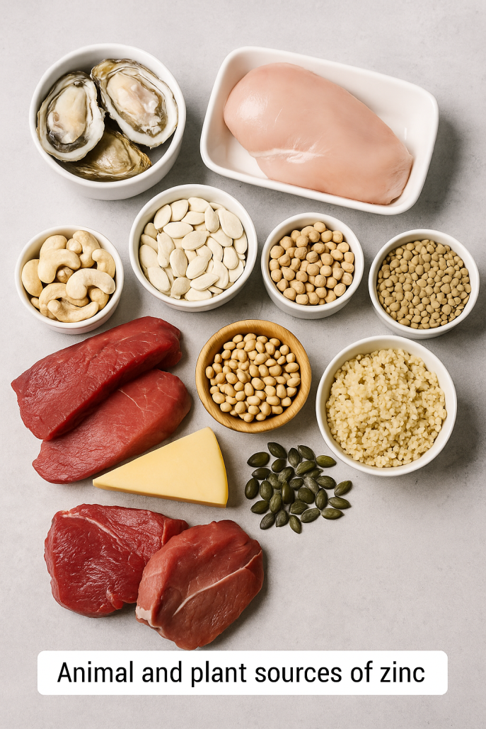 Zinc comes from both animal and plant foods, though your body absorbs it more easily from animal sources.